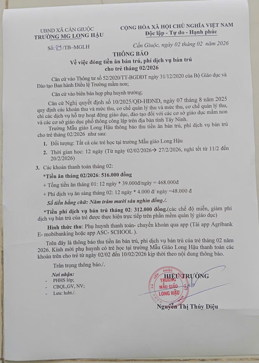 Thông báo số 89/TB-MGLH ngày 02/02/2026 thông báo về việc đóng tiền ăn bán trú, phí dịch vụ bán trú cho trẻ tháng 2/2026